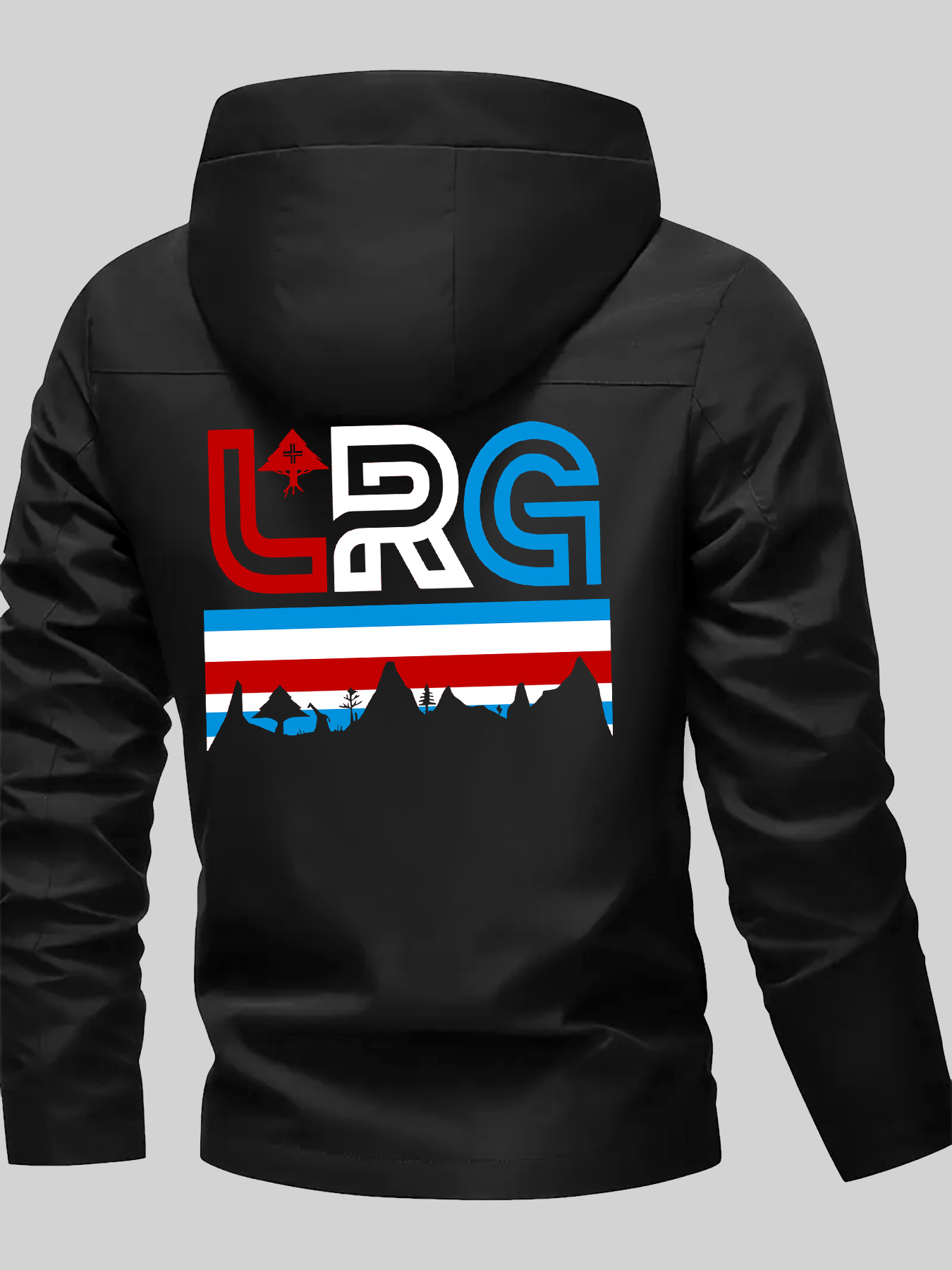 Unisex All-Season Windproof Hooded Jacket with Bold "LRG" Graphic Print - Loose Fit Outdoor Hiking & Casual Wear, Front Pockets, Black with Colorful Stripes, Hiking Gear, Durable Fabric