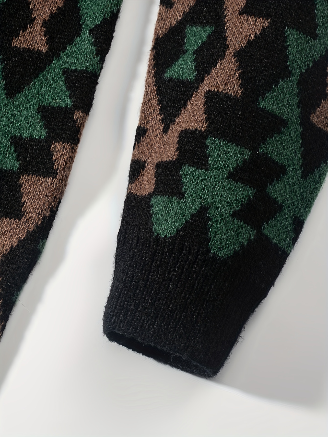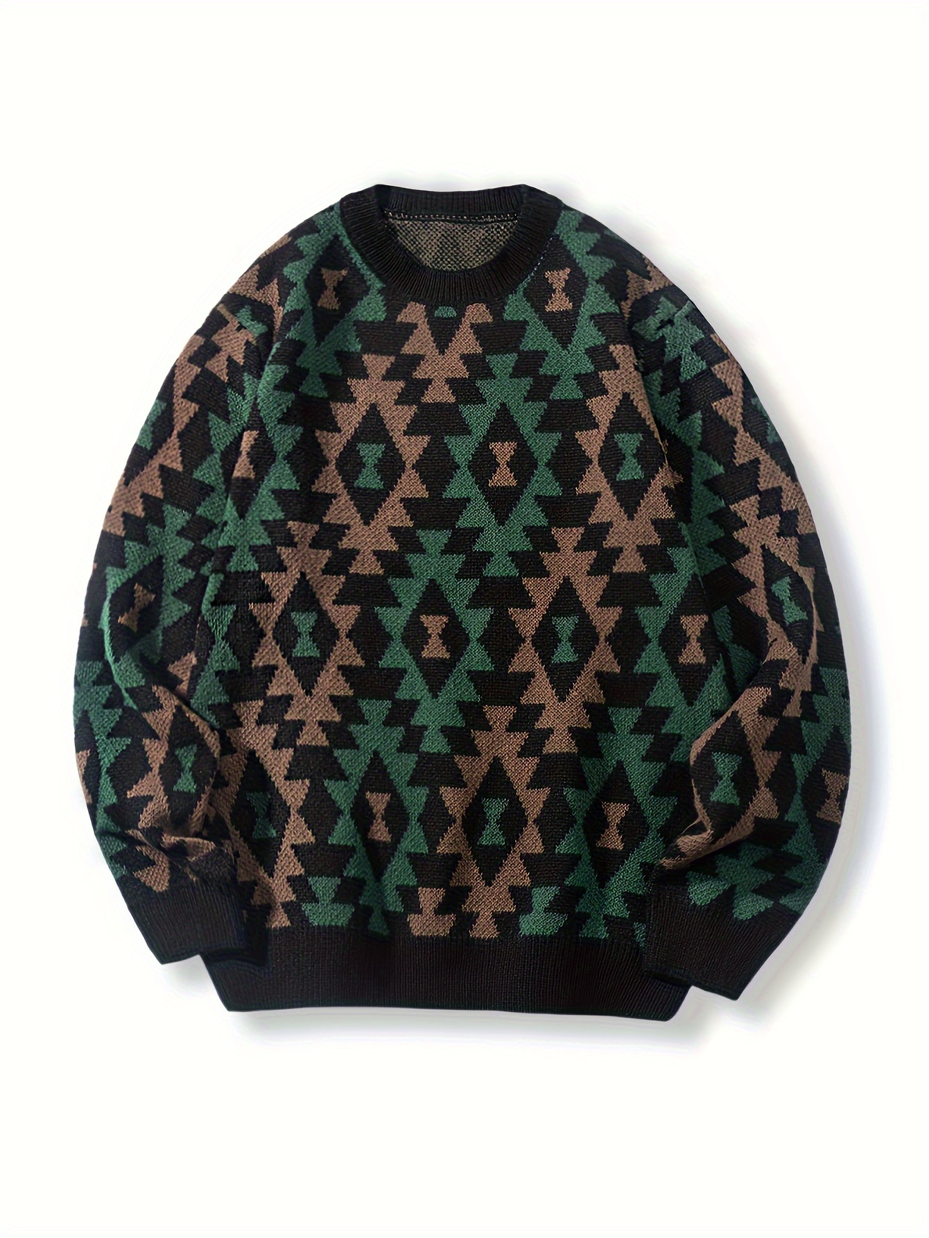 Men's Casual Geometric Pattern Knit Sweater - Asymmetrical Design, Machine Washable, Round Neck, Regular Fit for Autumn/Winter, Brown/Red/Black/White/Gray, Knit Sweater, Winter Warm Top, Autumn Fashion, Relaxed Fashion, Comfortable Wear, Durable Fabric
