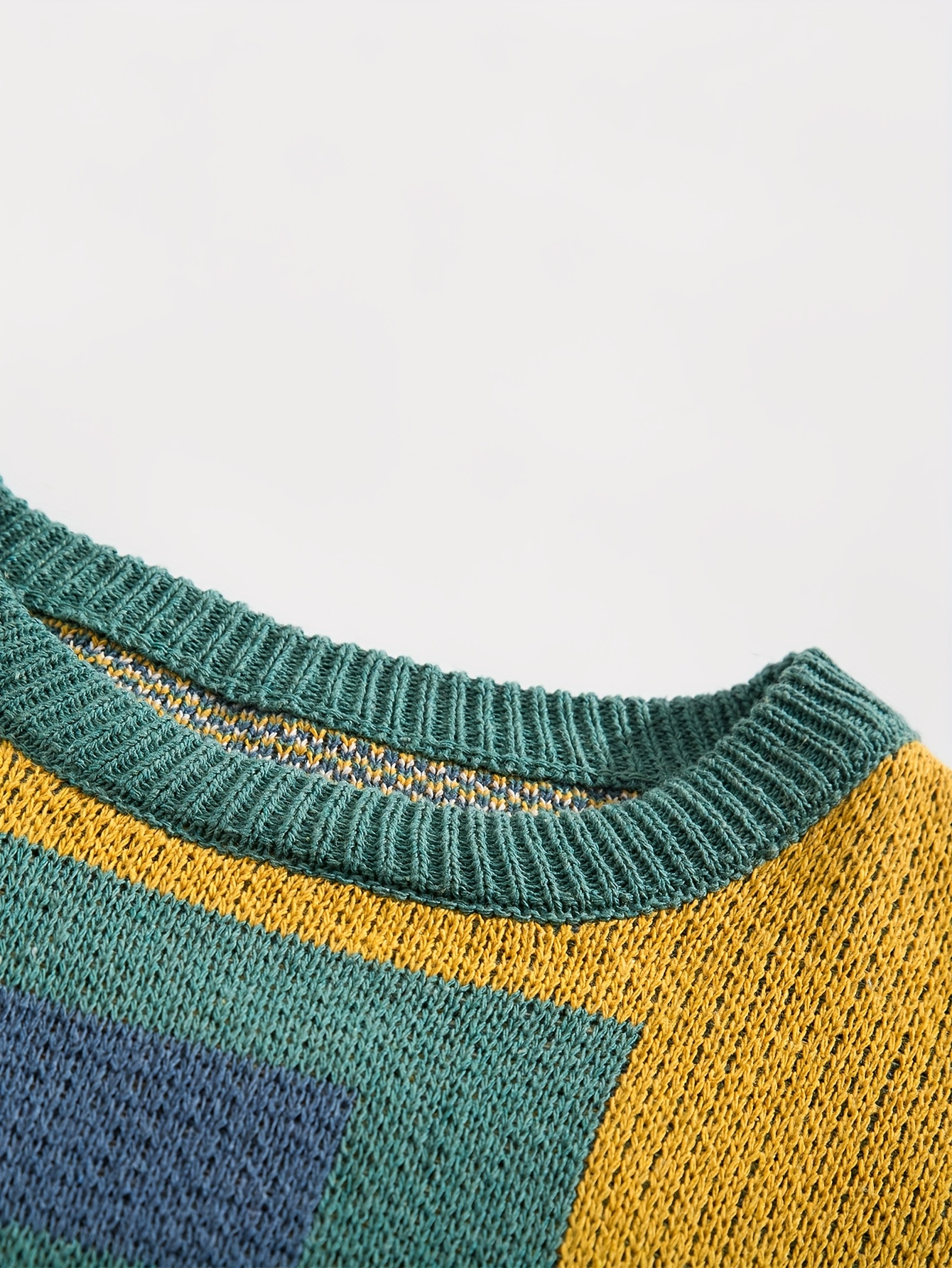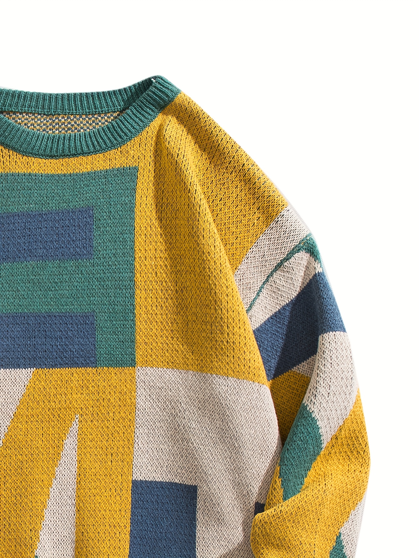 [Winter Sweater] Autumn/Winter Men's Geometric Color Block Sweater | Relaxed Drop Shoulder Fit, Mid-Stretch Fabric, Round Neck & Sleeves, Winter Comfort Clothing, Medium Elasticity Fabric