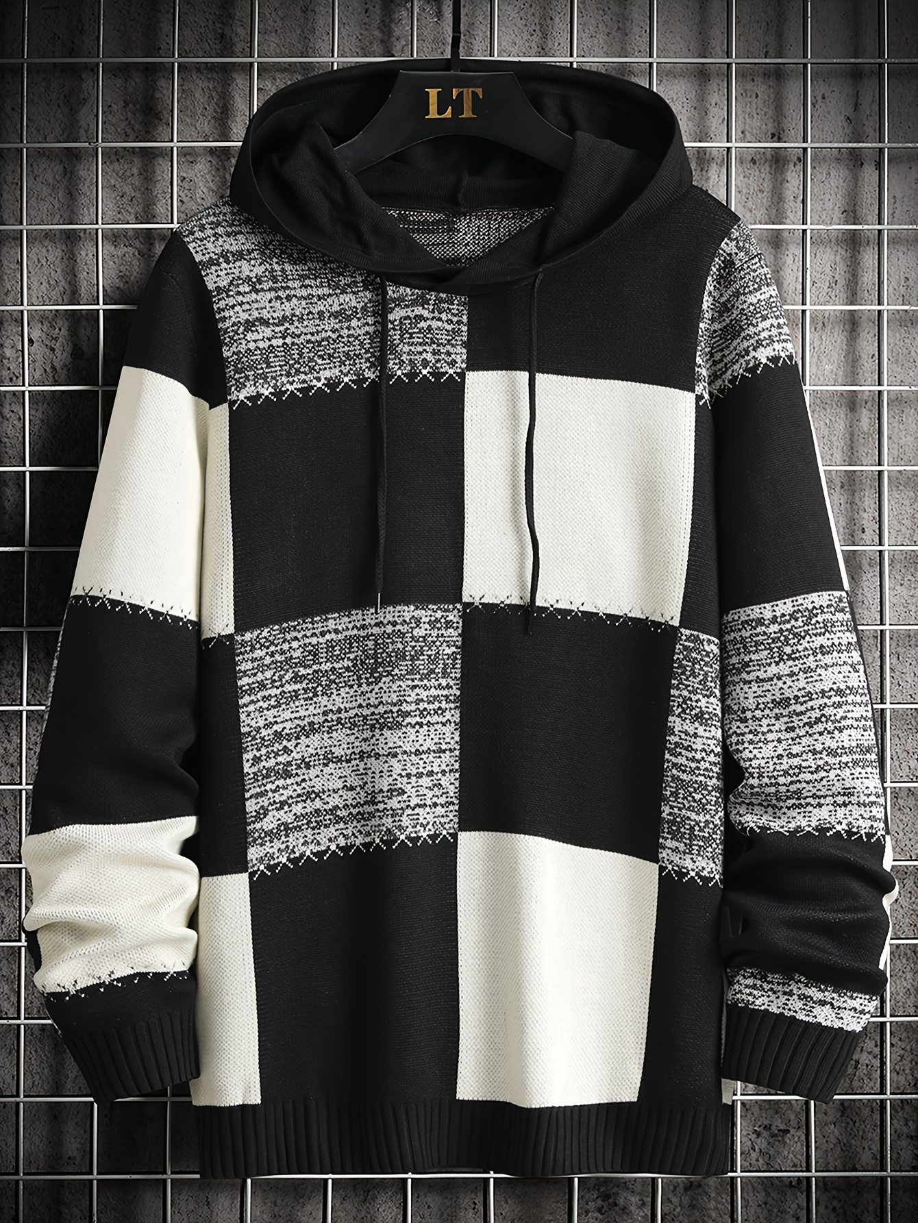 Men's Casual Hooded Color-Block Sweater - Black & Plaid Pattern, Sleeve Pullover with Ribbed Cuffs & Adjustable Drawstring Hood for Spring/Fall Daily Commute & Casual Outings, Sweater Hoodie, Durable Knitwear, Comfortable Fit