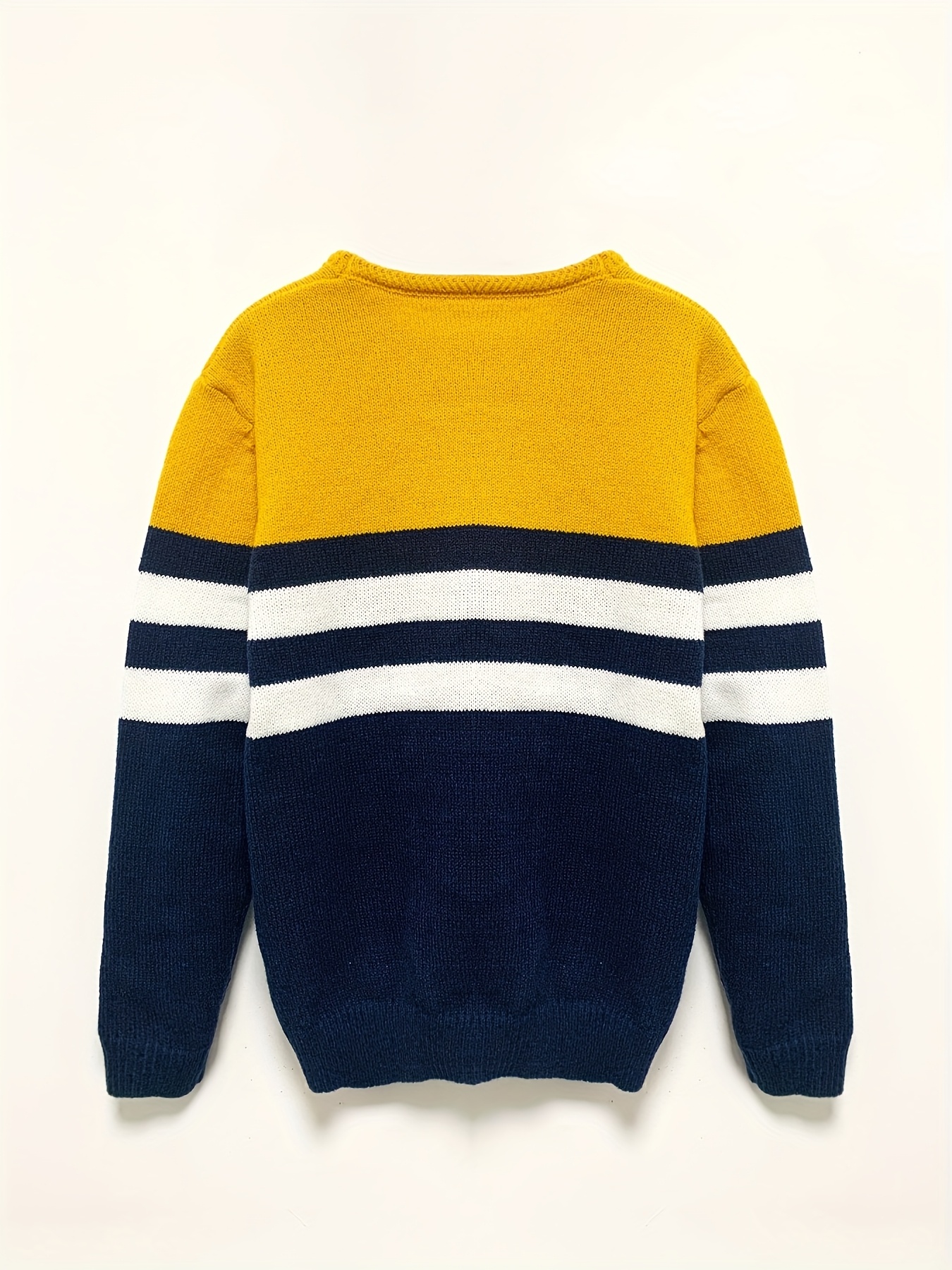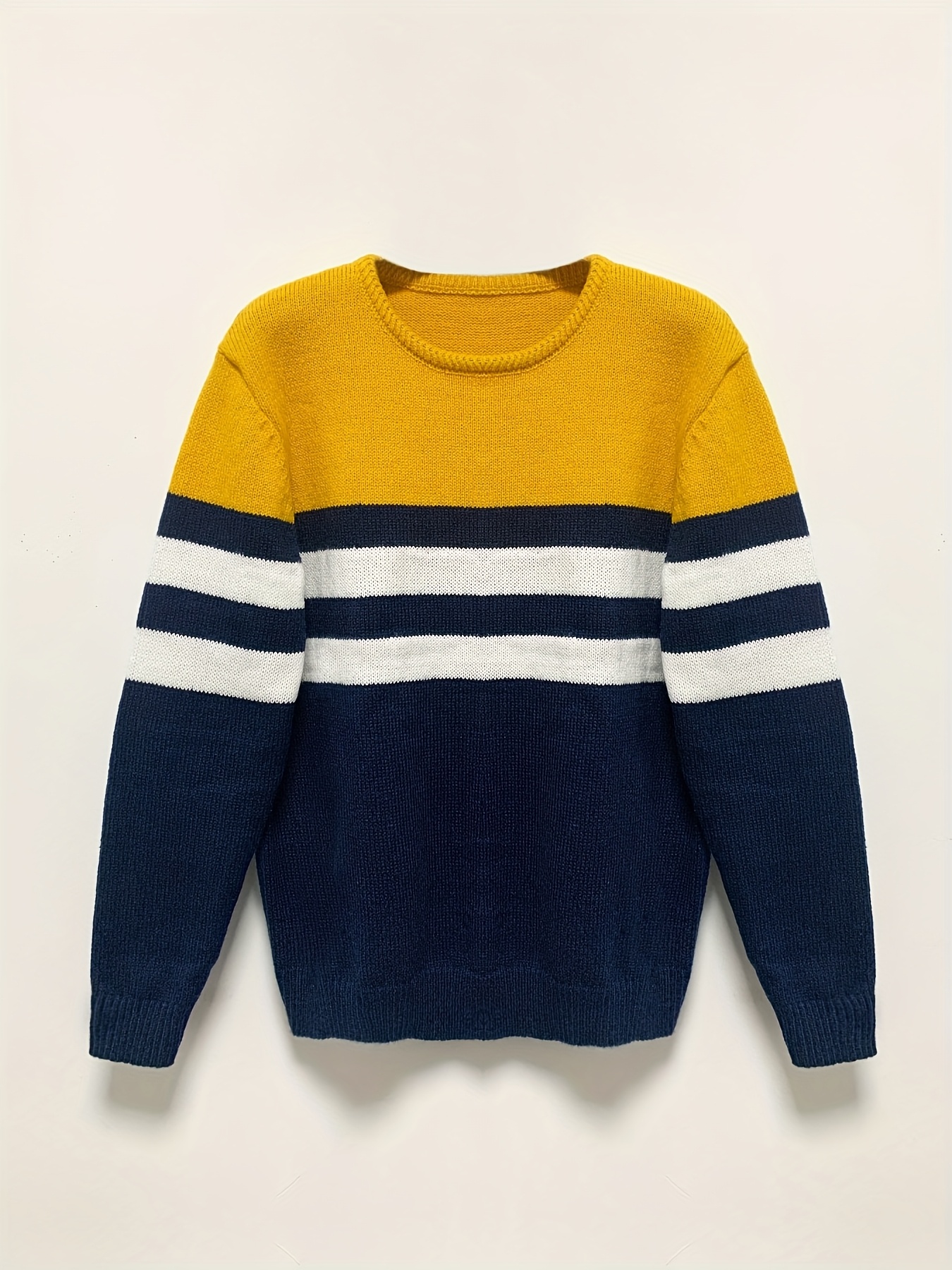 Men'S Casual Striped Sweater - Cozy Knit Pullover with Yellow, White & Navy Blue Horizontal Stripes, Long Sleeve Crew Neck for Fall/Winter, Sweater Vest