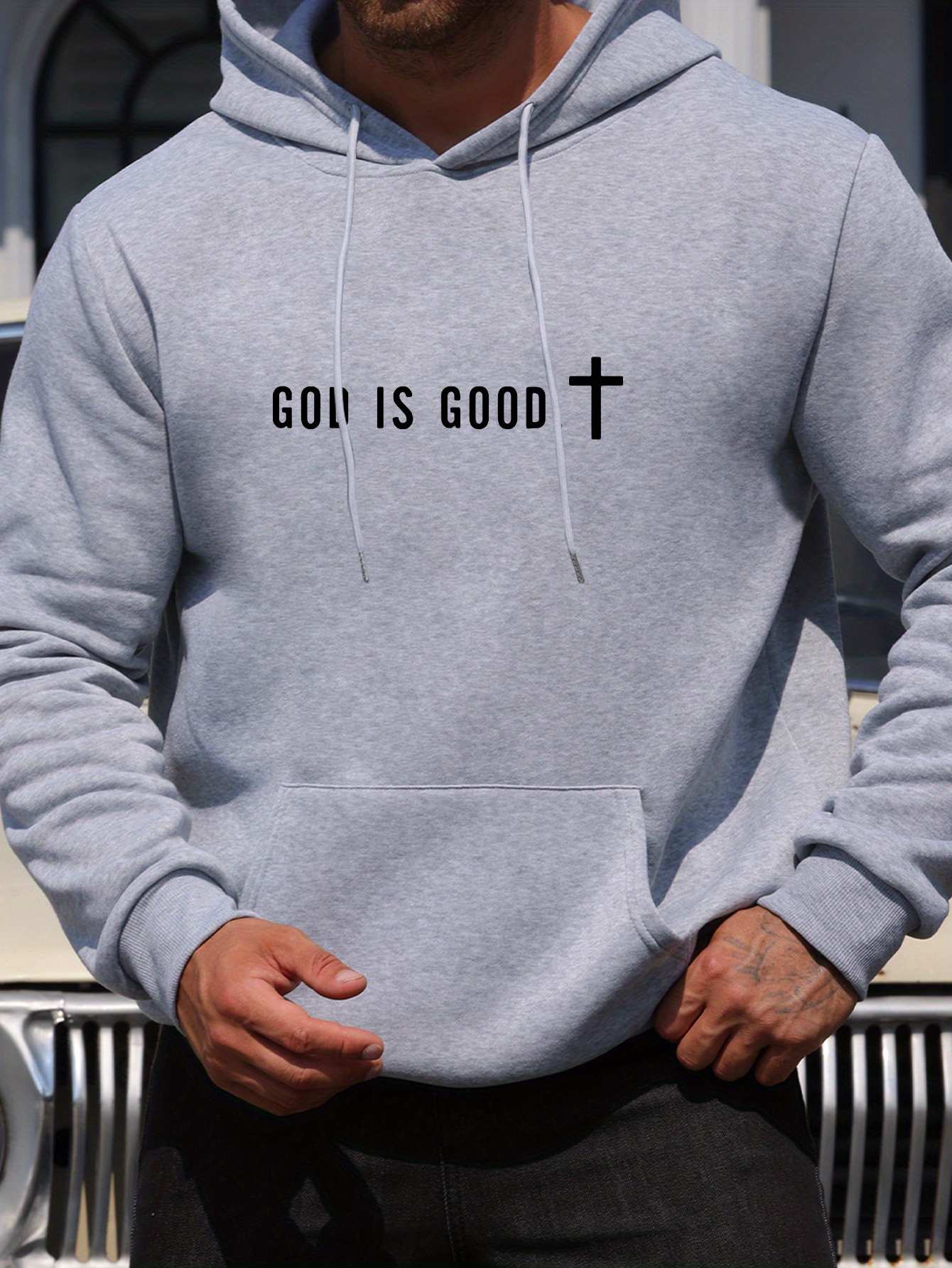 [Men's Cross Print Hooded Sweatshirt] Black Men's "GOD IS GOOD" & Cross Print Hooded Sweatshirt | Regular Fit, Casual Long Sleeve Pullover, Autumn Winter Warmth, Comfortable Versatile Casual Attire