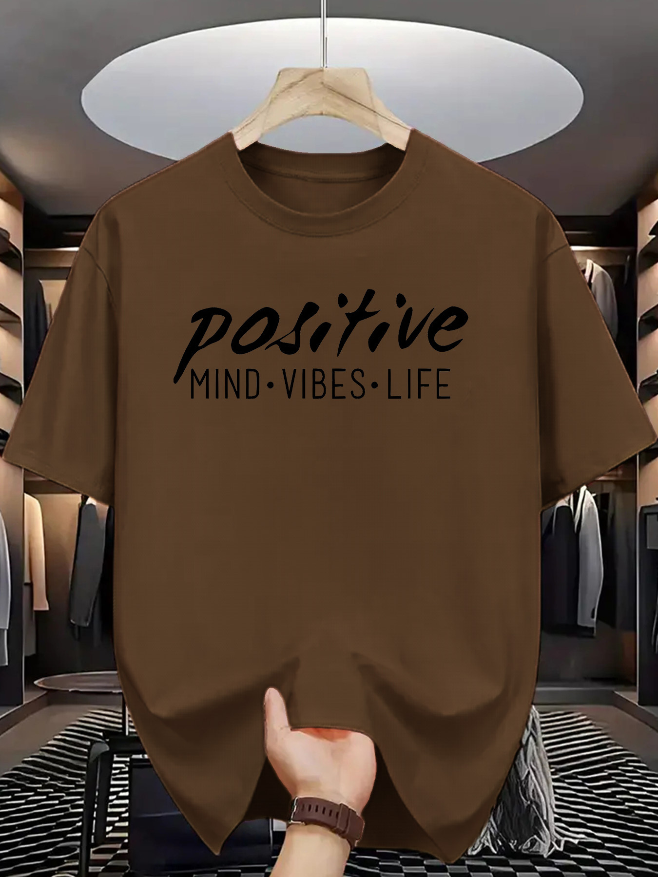 Men's Casual Short Sleeve T-Shirt with "Positive Mind Vibes Life" Print - Light Purple & Black Lettering, Round Neck Summer Top, Breathable Fabric, Machine Washable, Casual Wardrobe Staple | Casual Fashion | Comfortable Tshirt