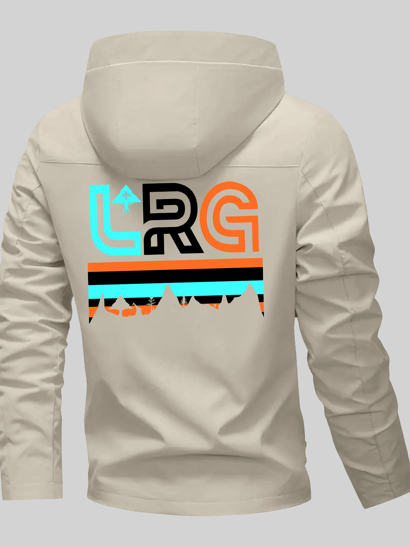 Unisex All-Season Windproof Hooded Jacket with Bold "LRG" Graphic Print - Loose Fit Outdoor Hiking & Casual Wear, Front Pockets, Black with Colorful Stripes, Hiking Gear, Durable Fabric